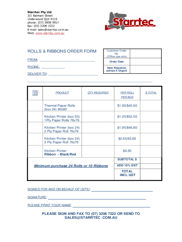 Started Pty Ltd 3/1 Balmier Street Underwood QLD 4119 phone: (07) 3808 9917 faxes: (07) 3208 7222 Email: sales starrtec.com.AU Web: www.starrtec.com.auROLLS & RIBBONS ORDER FORMCustomer Order No.