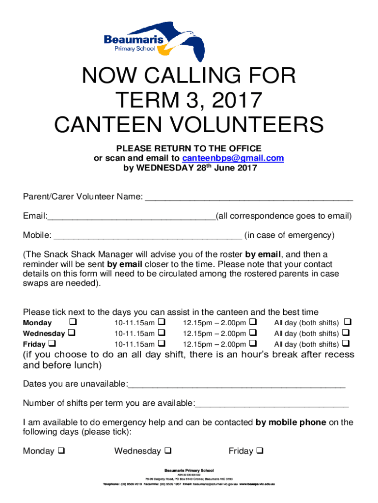 NOW CALLING FOR TERM 3, 2017 CANTEEN VOLUNTEERS PLEASE RETURN TO THE OFFICE or scan and email to canteen bps gmail.com by WEDNESDAY 28th June 2017Parent/Carer Volunteer Name: Email: (all correspondence
