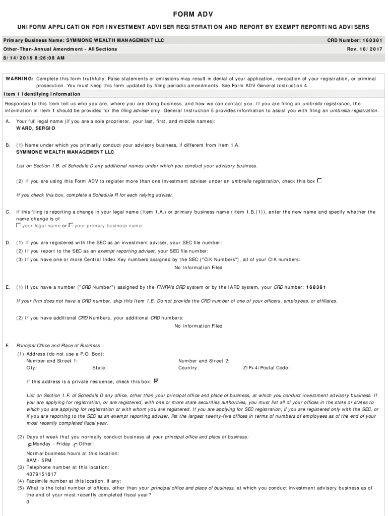 FORM ADV UNIFORM APPLICATION FOR INVESTMENT ADVISER REGISTRATION AND REPORT BY EXEMPT REPORTING ADVISERS Primary Business Name: SOMEONE WEALTH MANAGEMENT LLC CRD Number: 168381OtherThanAnnual Amendment