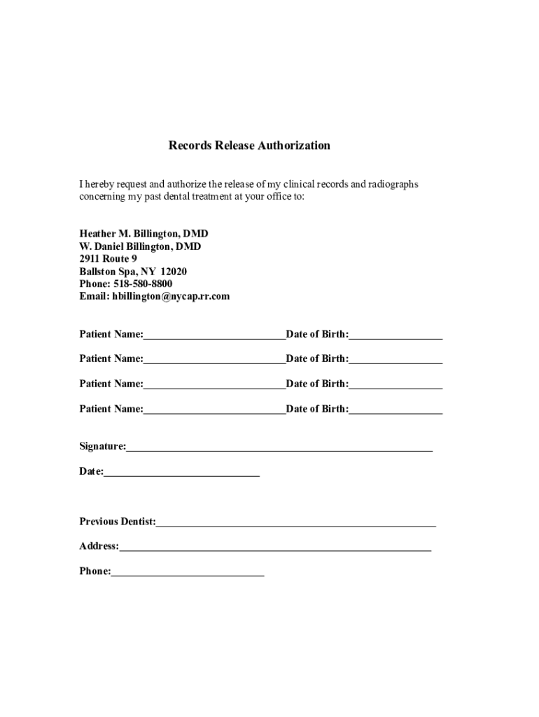 Records Release Authorization I hereby request and authorize the release of my clinical records and radiographs concerning my past dental treatment at your office to: Heather M. Billington, DMD W.