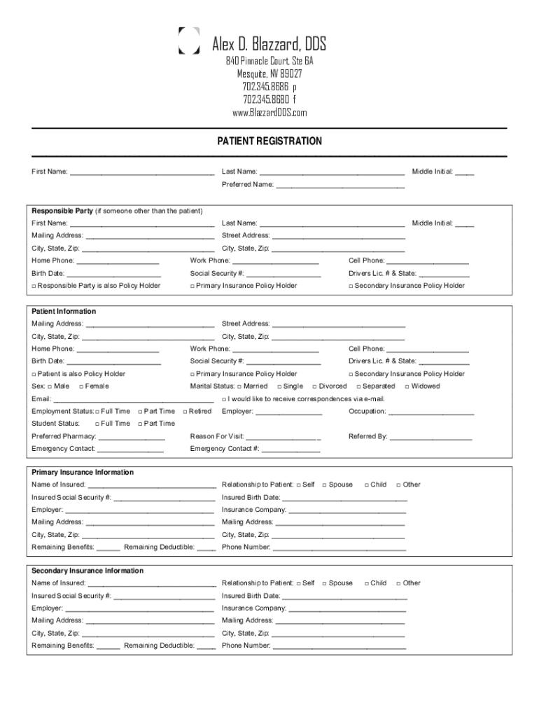 Alex D. Blizzard, DDS 840 Pinnacle Court, Ste 6A Mesquite, NV 89027 702.345.8686 p 702.345.8680 f www.BlazzardDDS.com PATIENT REGISTRATION First Name: Last Name: Middle Initial: Preferred Name: Responsible