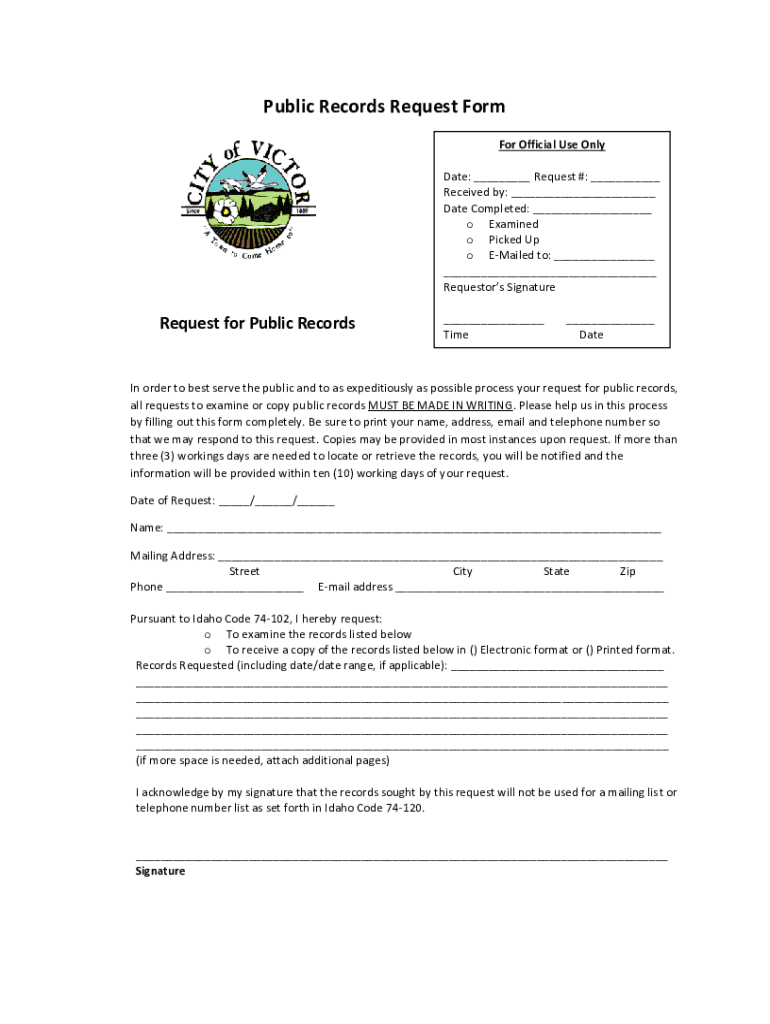 Public Records Request Form For Official Use Only Date: Request #: Received by: Date Completed: o Examined o Picked Up o Emailed to: Requestors SignatureRequest for Public Records Time Date In order