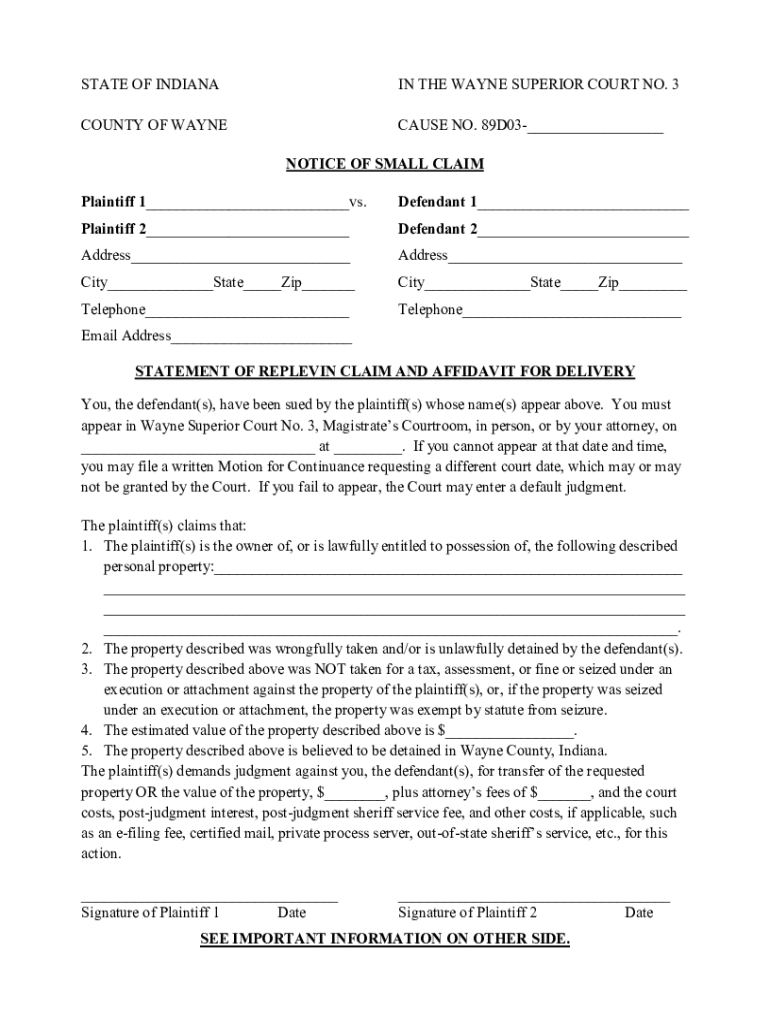 STATE OF INDIANAN THE WAYNE SUPERIOR COURT NO. 3COUNTY OF WAYNECAUSE NO. 89D03 NOTICE OF SMALL CLAIMPlaintiff 1 vs. Defendant 1 Plaintiff 2 Defendant 2 Address City State Zip City State Zip Telephone