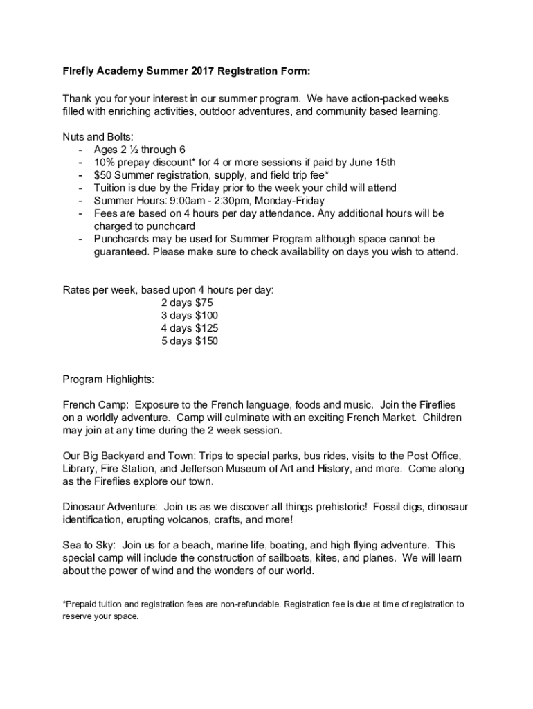 Firefly Academy Summer 2017 Registration Form: Thank you for your interest in our summer program. We have action packed weeks filled with enriching activities, outdoor adventures, and community based