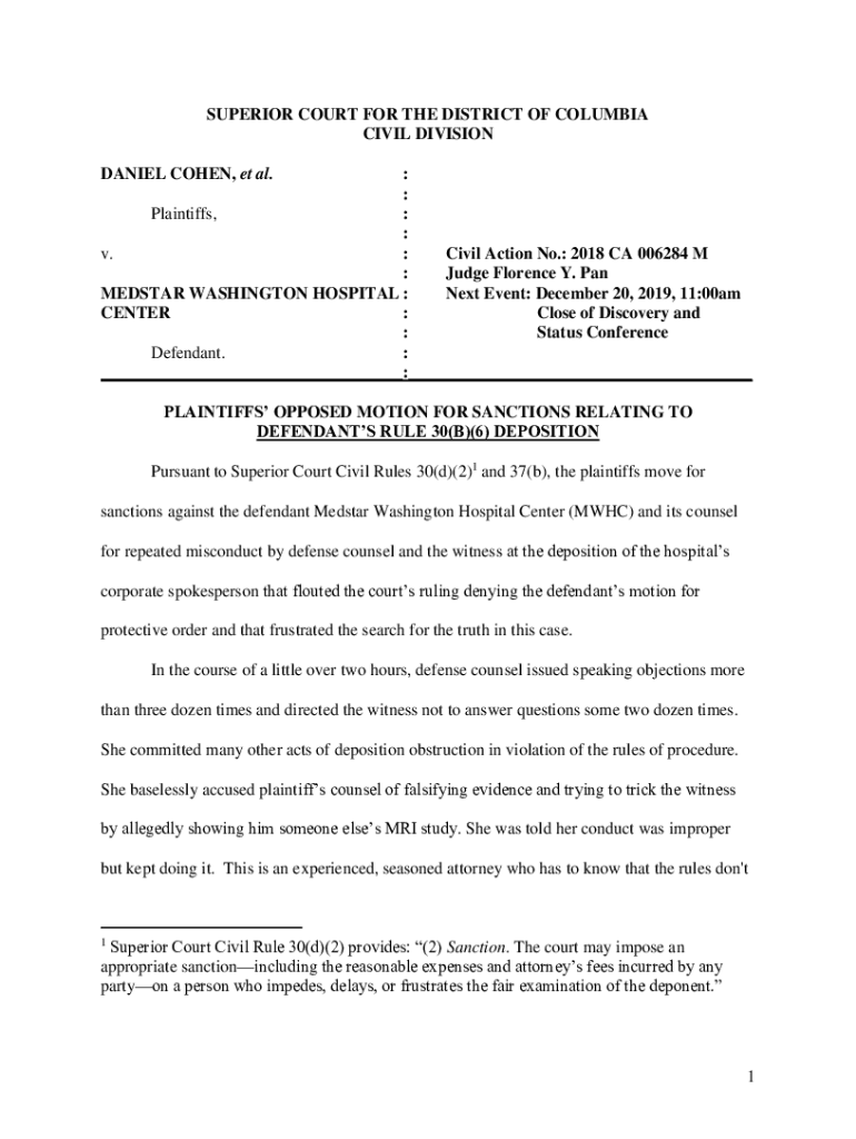 SUPERIOR COURT FOR THE DISTRICT OF COLUMBIA CIVIL DIVISION DANIEL COHEN, et al.: : Plaintiffs, : : v. : Civil Action No.: 2018 CA 006284 M : Judge Florence Y. Pan MED STAR WASHINGTON HOSPITAL : Next