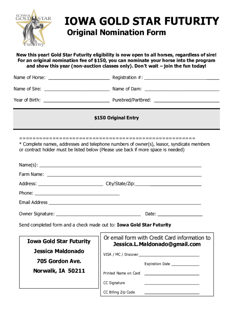 IOWA GOLD STAR FUTURITY Original Nomination Form New this year! Gold Star Futurity eligibility is now open to all horses, regardless of sire! For an original nomination fee of $150, you can nominate