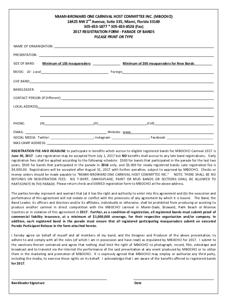 MIAMIBROWARD ONE CARNIVAL HOST COMMITTEE INC. (COCCI) 18425 NW 2nd Avenue, Suite 335, Miami, Florida 33169 3056531877 × 3056538528 (Fax) 2017 REGISTRATION FORM PARADE OF BANDS PLEASE PRINT OR TYPE