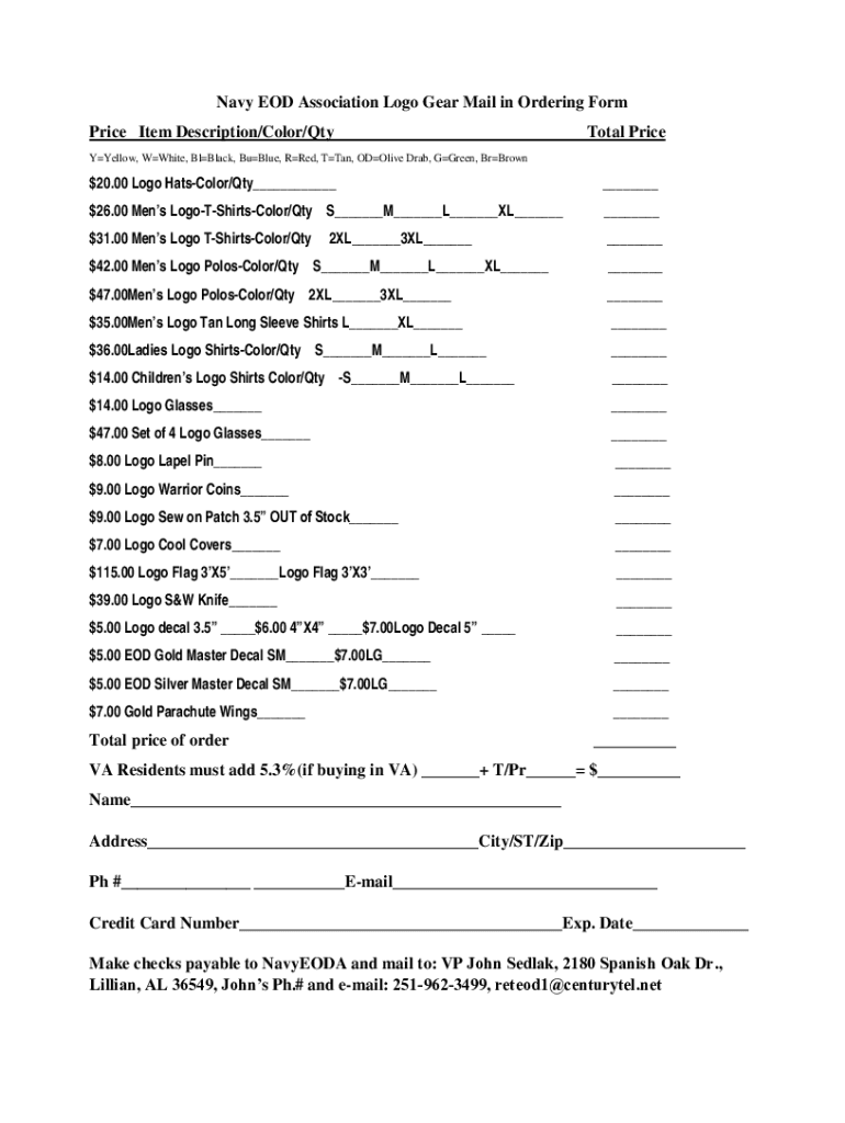 Navy EOD Association Logo Gear Mail in Ordering Form Price Item Description/Color/Total PriceYYellow, White, Black, Blue, Red, Then, OD Olive Drab, Green, BrBrown$20.00 Logo Watercolor/Qty $26.00