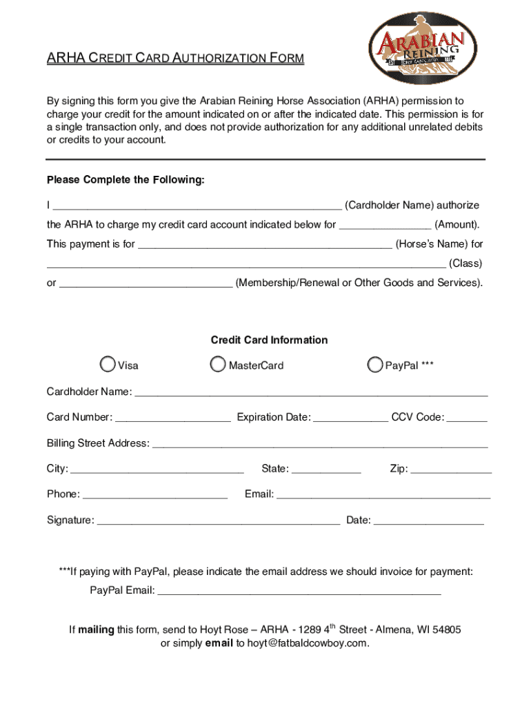 AREA CREDIT CARD AUTHORIZATION FORM By signing this form you give the Arabian Reining Horse Association (AREA) permission to charge your credit for the amount indicated on or after the indicated date.