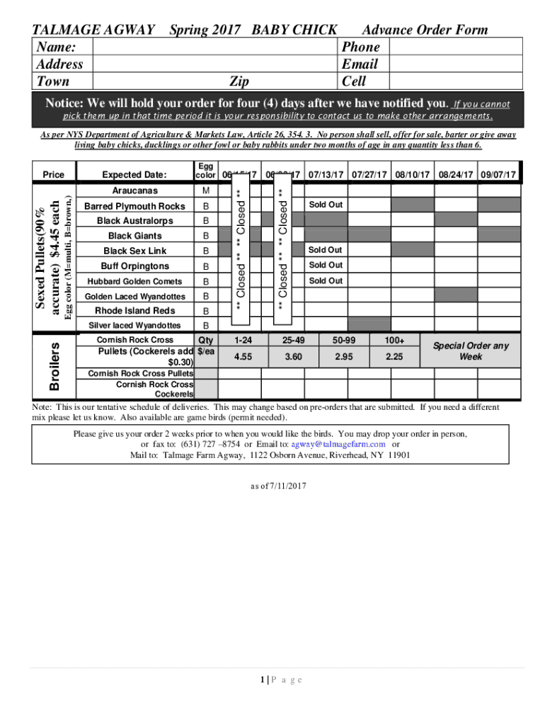 SavePrintEmailTALMAGE AWAY Spring 2017 BABY CHICK Advance Order Form Name: Phone Address Email Town Zip Cell Notice: We will hold your order for four (4) days after we have notified you. If you cannot