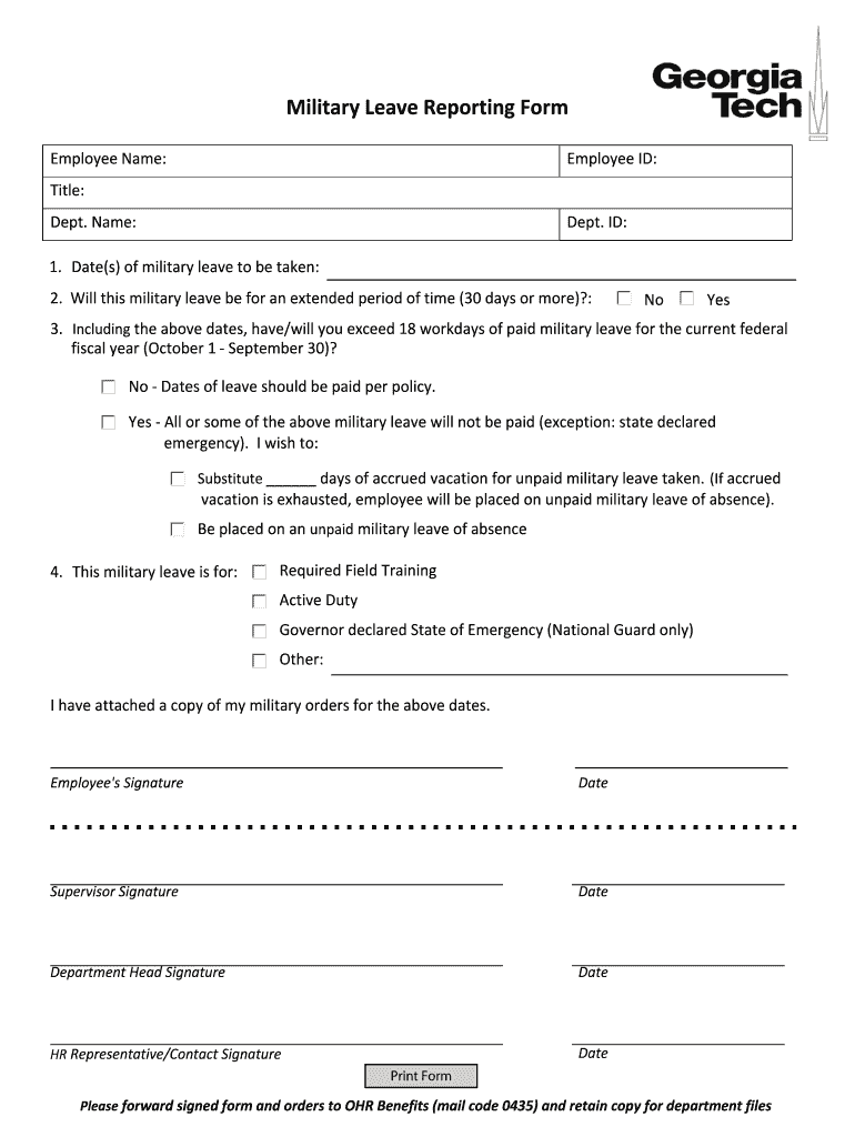 Employees who are called to active military duty are eligible to fill out the Military Leave Reporting Form to notify their employer about their leave.