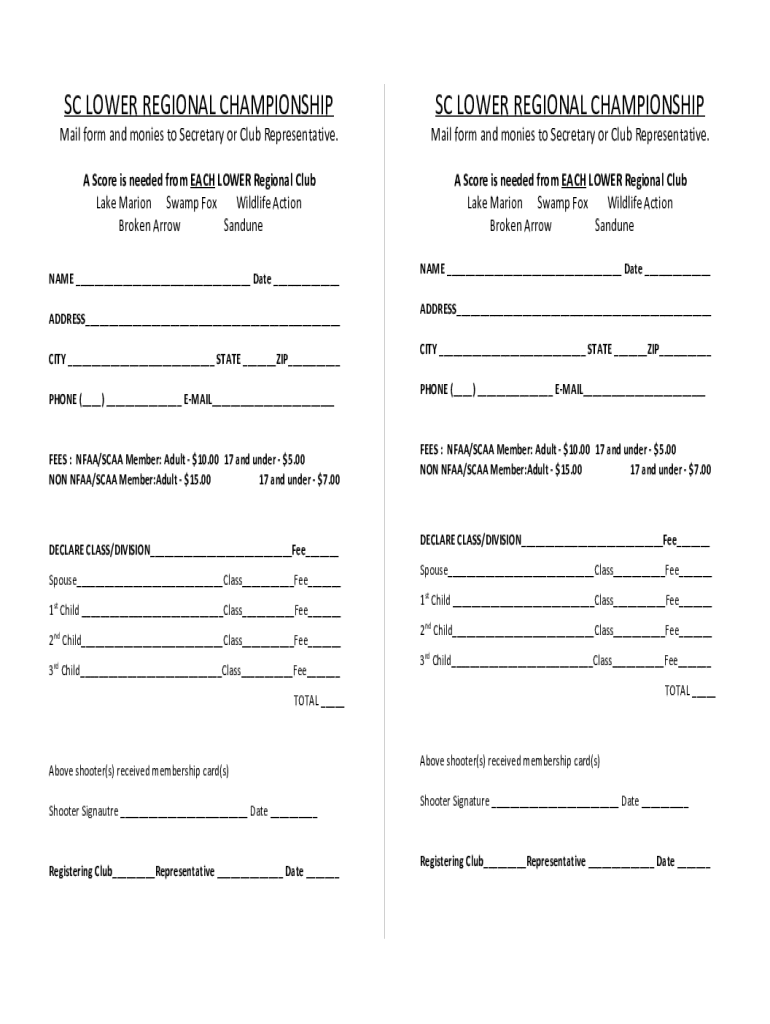 SC LOWER REGIONAL CHAMPIONSHIPS LOWER REGIONAL CHAMPIONSHIPMail form and monies to Secretary or Club Representative. Mail form and monies to Secretary or Club Representative. A Score is needed from