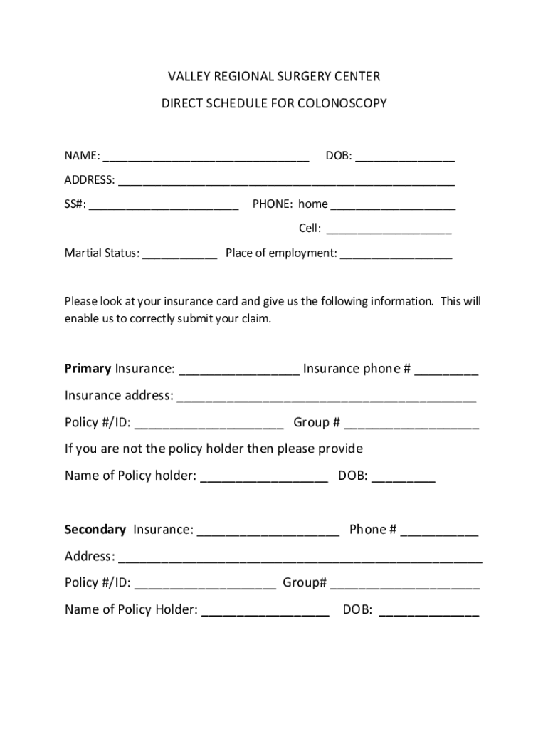 VALLEYREGIONALSURGERYCENTER DIRECTSCHEDULEFORCOLONOSCOPY NAME: DOB: ADDRESS: SS#: PHONE:home Cell: MartialStatus: Placeofemployment: Pleaselookatyourinsurancecardand