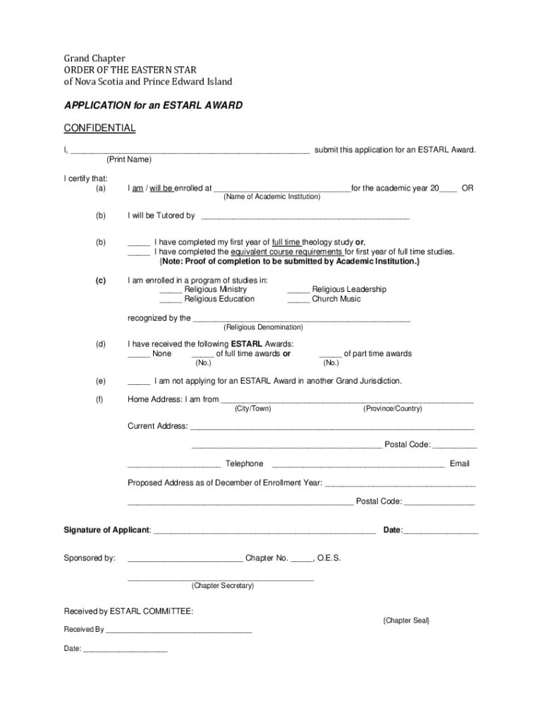 Grand Chapter ORDER OF THE EASTERN STAR of Nova Scotia and Prince Edward Island APPLICATION for an EST ARL AWARD CONFIDENTIAL I, submit this application for an EST ARL Award. (Print Name) I certify