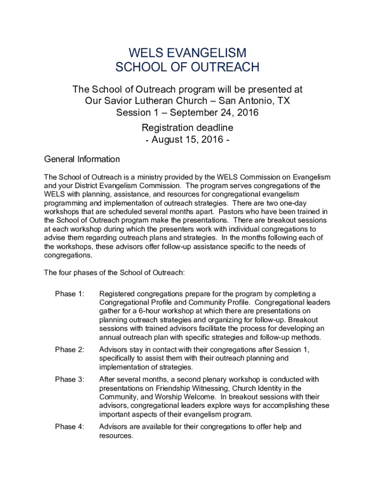 WELL EVANGELISM SCHOOL OF OUTREACH The School of Outreach program will be presented at Our Savior Lutheran Church San Antonio, TX Session 1 September 24, 2016, Registration deadline August 15, 2016,