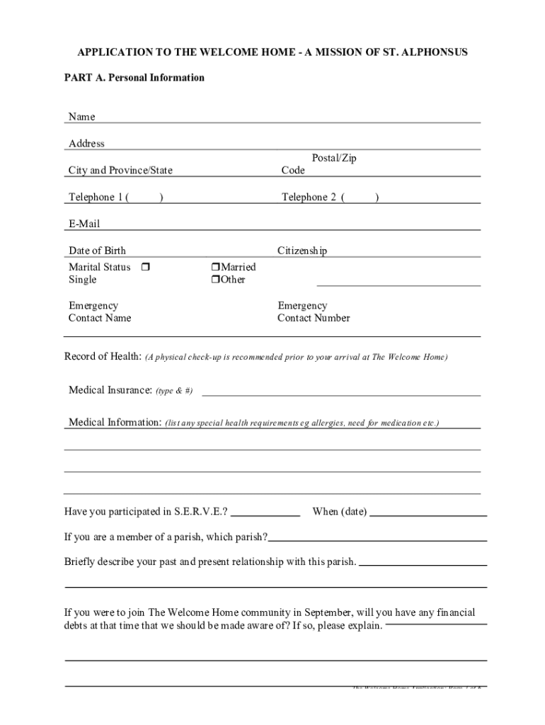 APPLICATION TO THE WELCOME HOME A MISSION OF ST. ALPHONSE PART A. Personal Information Name Address Postal/Zip City and Province/StateCodeTelephone 1 (Telephone 2 ())Email Date of Birth Marital Status