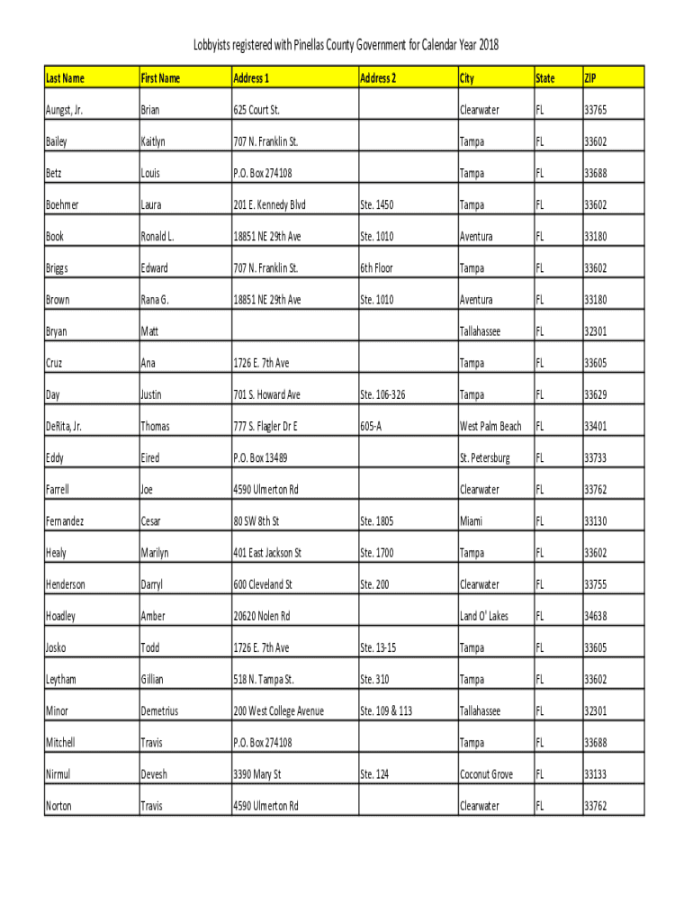 Lobbyists registered with Pinellas County Government for Calendar Year 2018
