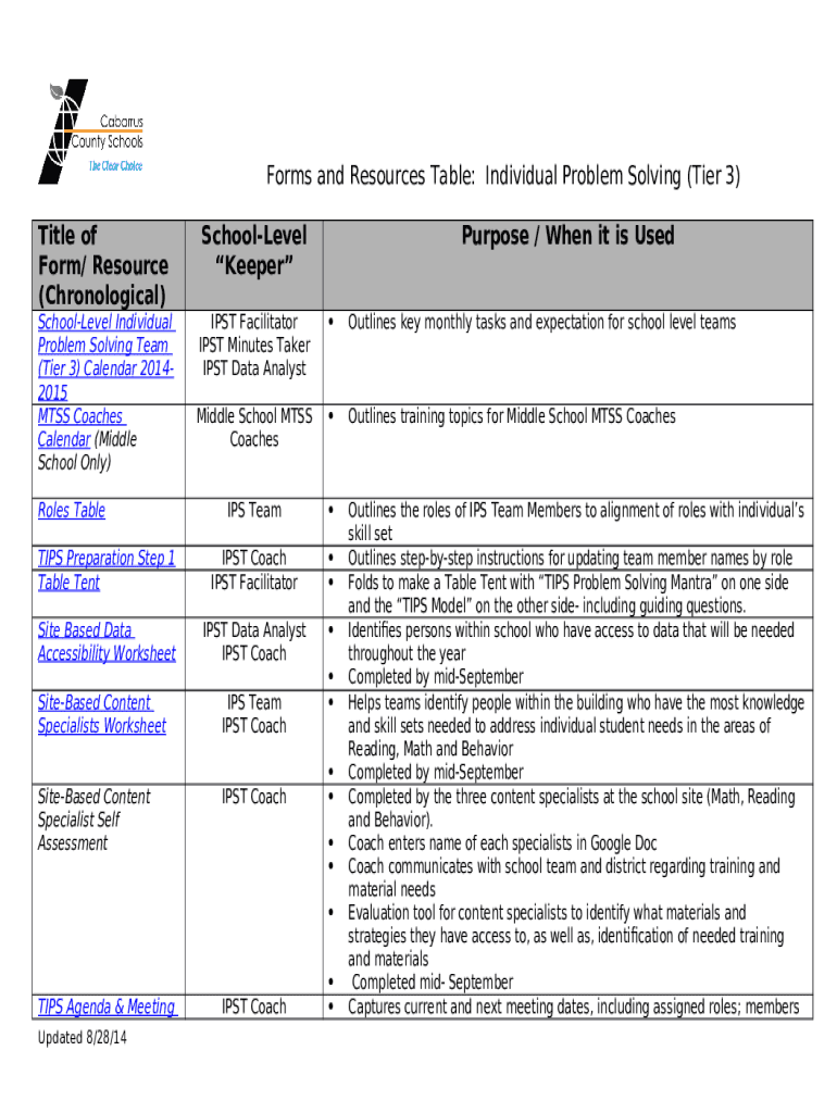 The s and Resources Table: Individual Problem Solving (Tier ... is a Word document that should be submitted to the relevant address to provide some info. It must be completed and signed, which can be done manually in hard copy, or by using a particular solution such as PDFfiller. It allows to fill out any PDF or Word document right in the web, customize it depending on your needs and put a legally-binding electronic signature. Once after completion, you can send the s and Resources Table: Individual Problem Solving (Tier ... to the appropriate receiver, or multiple recipients via email or fax. The editable template is printable as well thanks to PDFfiller feature and options presented for printing out adjustment. Both in digital and in hard copy, your form will have got neat and professional outlook. You may also turn it into a template for later, without creating a new blank form from the beginning. You need just to customize the ready document.