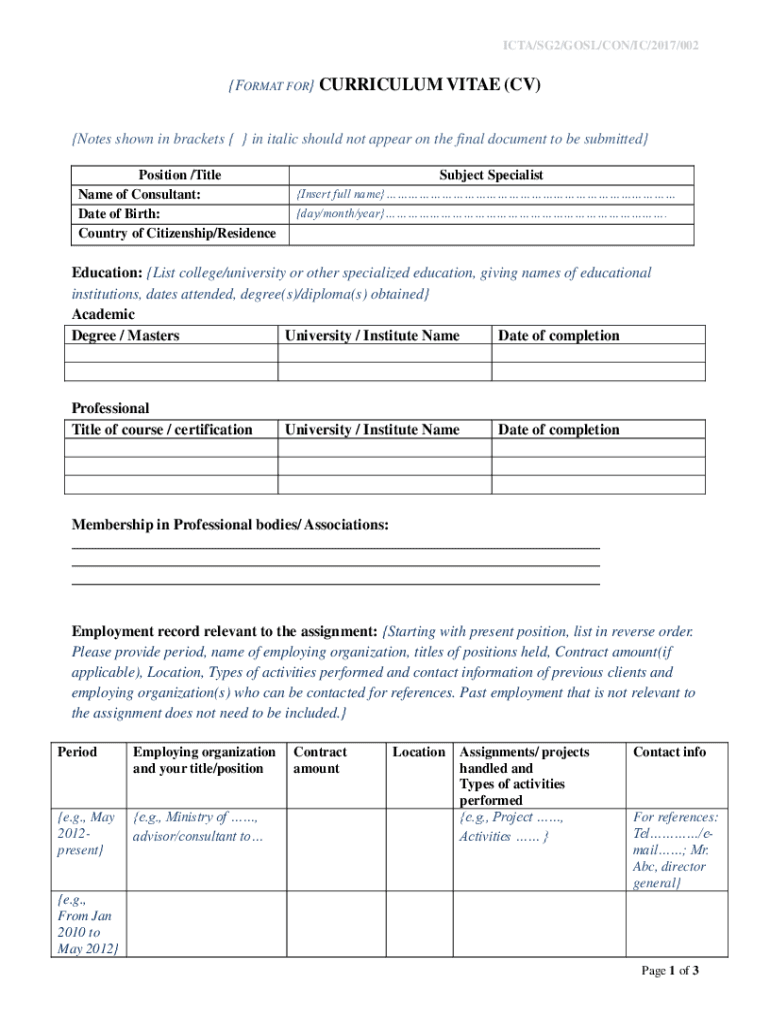 ICT/SG2/GOAL/CON/IC/2017/002FORMAT FOR CURRICULUM VITAE (CV)Notes shown in brackets in italic should not appear on the final document to be submitted Position /Title Name of Consultant: Date of Birth: