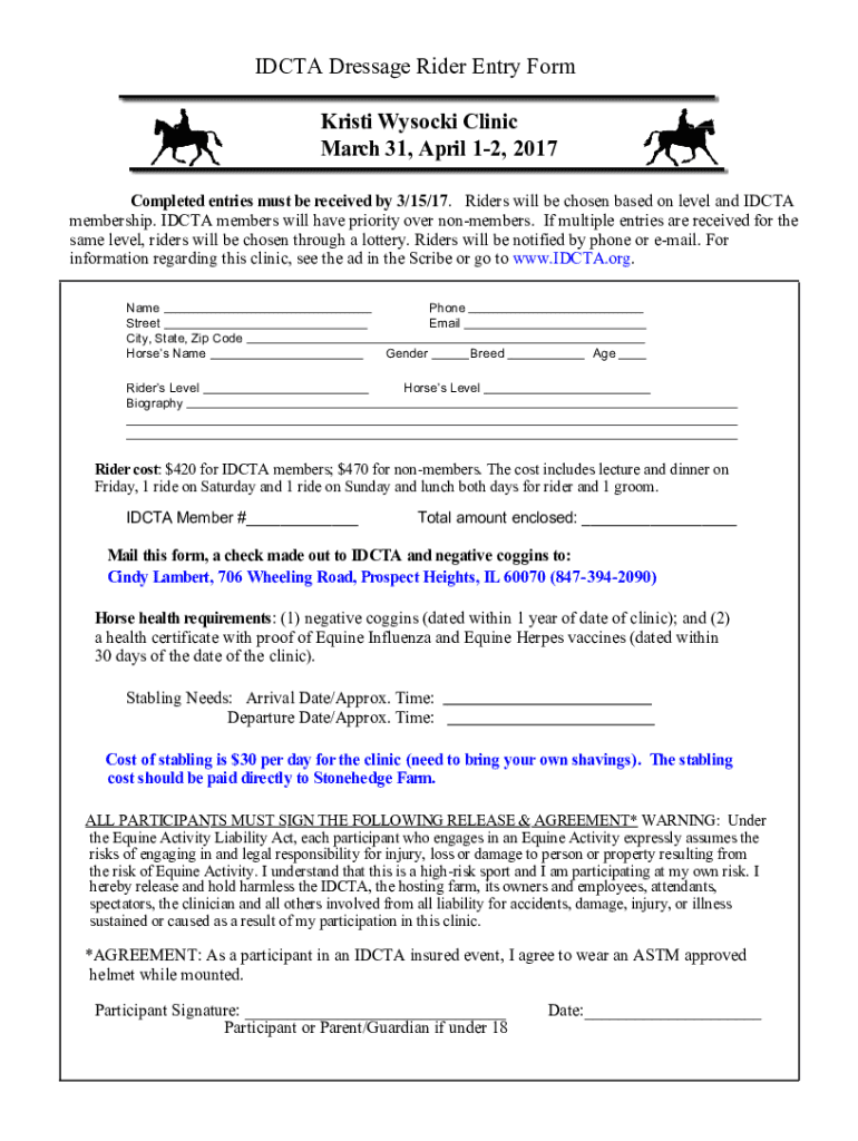 Completed entries must be received by 3/15/17. Riders will be chosen based on level and ID CTA