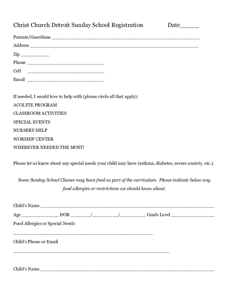 Christ Church Detroit Sunday School RegistrationDate Parents/Guardians Address Zip Phone Cell Email If needed, I would love to help with (please circle all that apply): ACOLYTE PROGRAM CLASSROOM ACTIVITIES