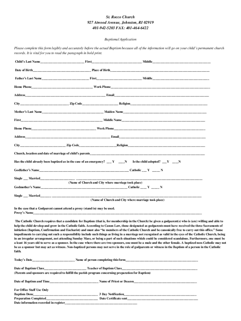 St. Rocco Church 927 Atwood Avenue, Johnston, RI 02919 4019425203 FAX: 4014646422 Baptismal Application Please complete this form legibly and accurately before the actual Baptism because all the information