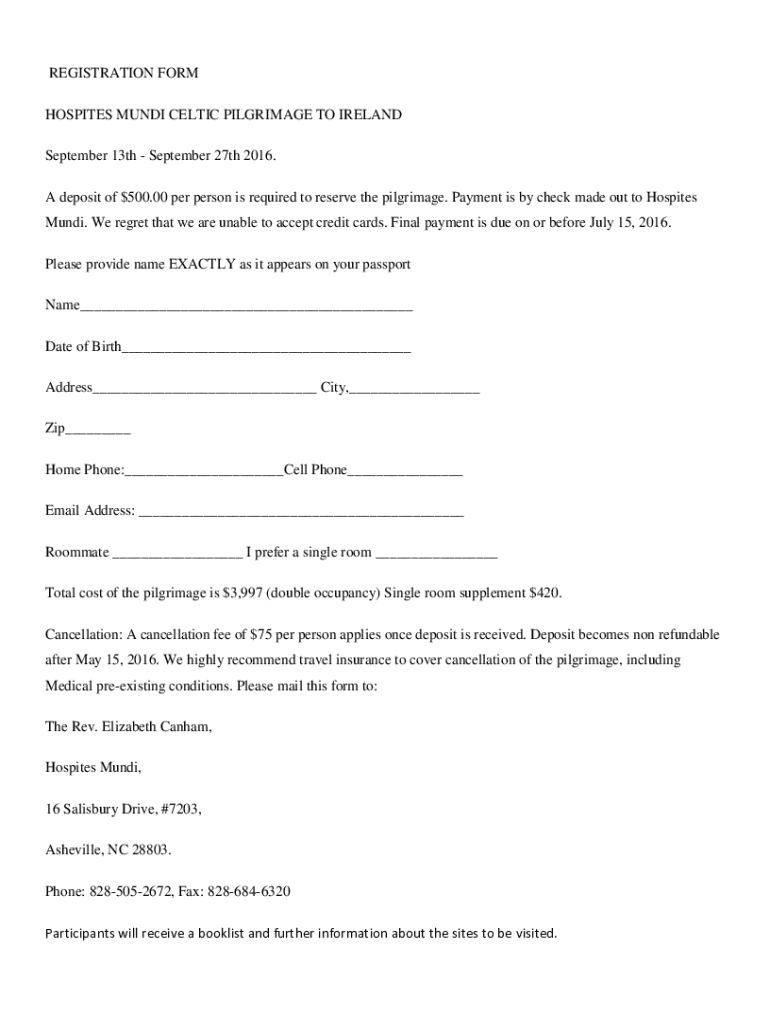 REGISTRATION FORM HOSPICES MUN DI CELTIC PILGRIMAGE TO IRELAND September 13th September 27th 2016. A deposit of $500.00 per person is required to reserve the pilgrimage. Payment is by check made out
