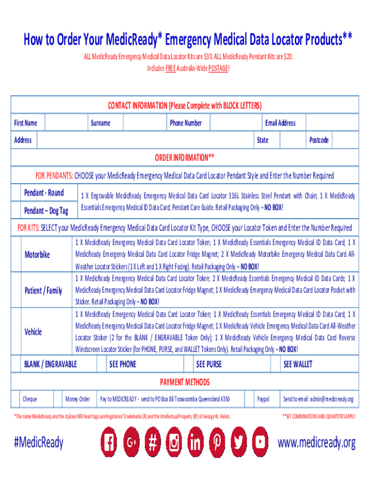 How to Order Your McCready* Emergency Medical Data Locator Products** ALL McCready Emergency Medical Data Locator Kits are $30. ALL McCready Pendant Kits are $20. Includes FREE Australianize POSTAGE!CONTACT