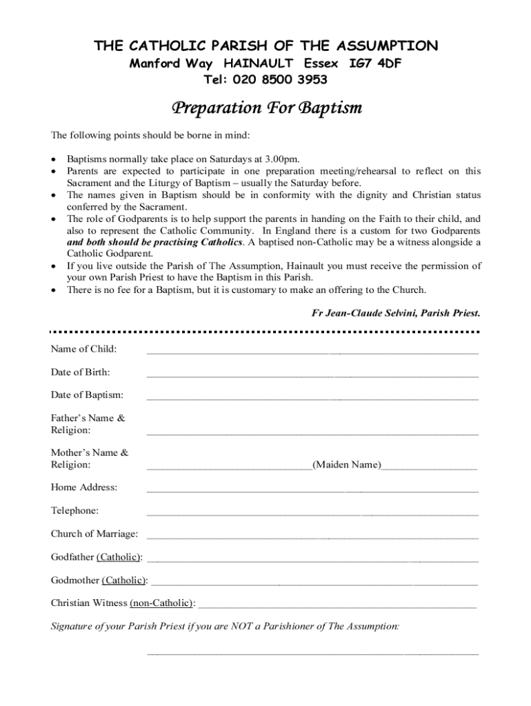 THE CATHOLIC PARISH OF THE ASSUMPTION Sanford Way HAINAUT Essex IG7 4DF Tel: 020 8500 3953Preparation For Baptism The following points should be borne in mind: Baptisms normally take place on Saturdays