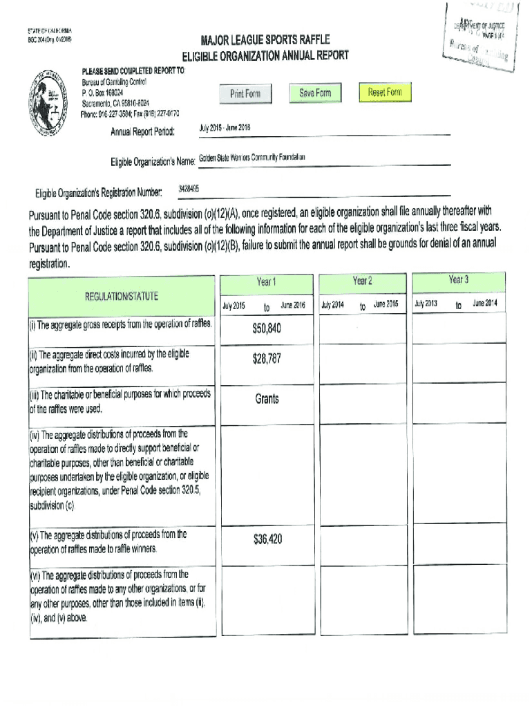 “ STATE OF CALIFORNIA BGC 204 (Orig. 0 1/2016)MAJOR LEAGUE E SPORTS RAFFLE ELIGIBLE ORGANIZATION ANNUAL REPORT PLEASE SEND COMPLETED REPORT TO :Bureau of Gambling Control P. 0. Box 168024 Sacramento,
