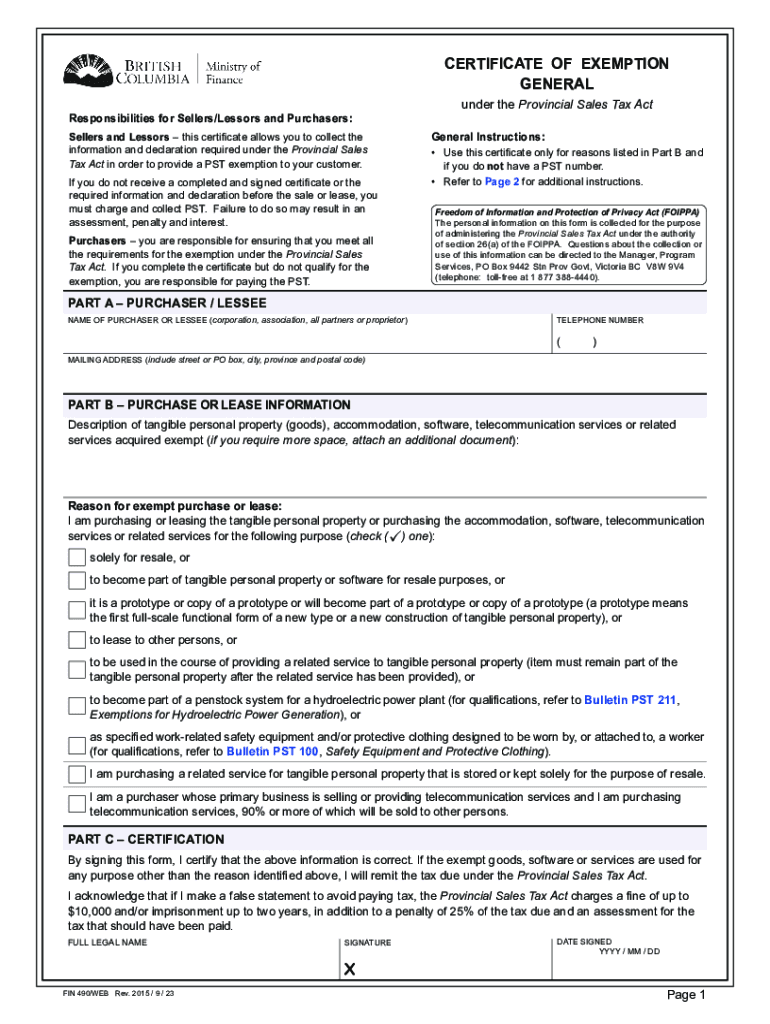 Get the free FIN 492, Certificate of Exemption - Production ... - Gov.bc.ca