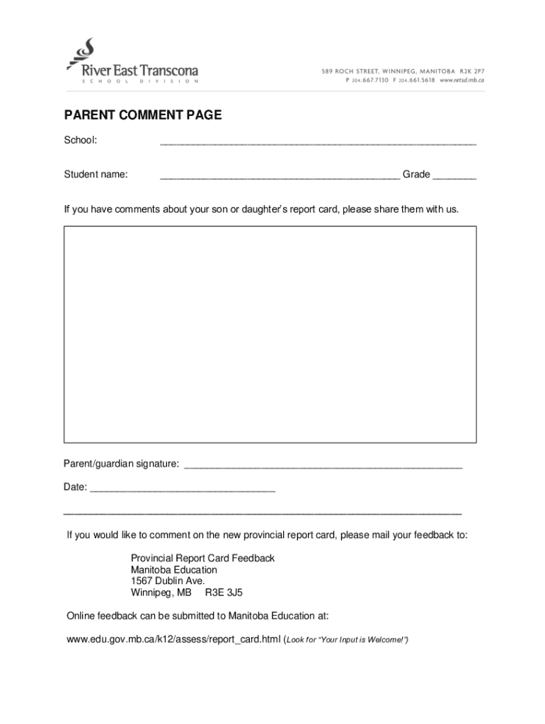 PARENT COMMENT PAGE School: Student name: Grade If you have comments about your son or daughters report card, please share them with us. Parent/guardian signature: Date: If you would like to comment