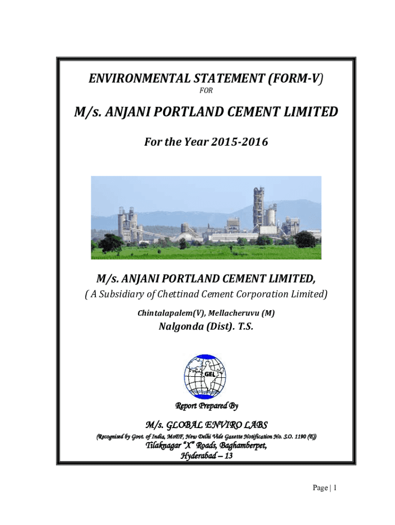 ENVIRONMENTAL STATEMENT (FORM) FORM/s. ANJ ANI PORTLAND CEMENT LIMITED For the Year 20152016M/s. ANJ ANI PORTLAND CEMENT LIMITED, (A Subsidiary of Cheating Cement Corporation Limited) Chintalapalem(V),