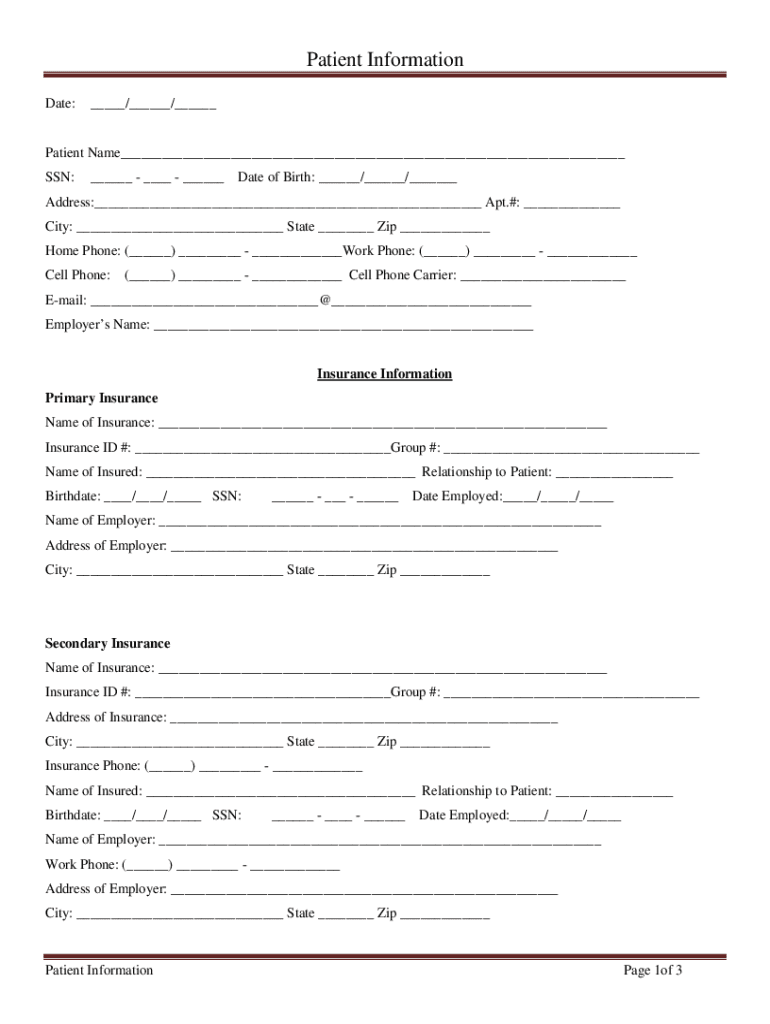 Patient Information Date: / / Patient Name SSN: Date of Birth: / / Address: Apt.#: City: State Zip Home Phone: () Work Phone: () Cell Phone:() Cell Phone Carrier: Email: Employers Name: Insurance