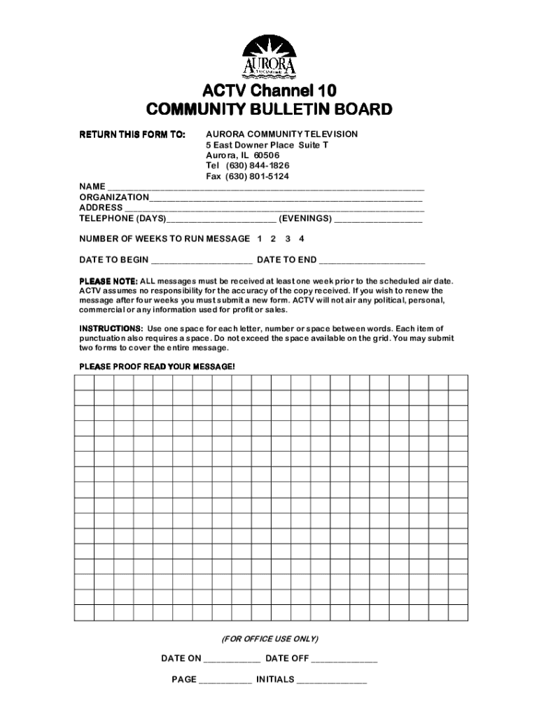 ACT Channel 10 COMMUNITY BULLETIN BOARD RETURN THIS FORM TO:AURORA COMMUNITY TELEVISION 5 East Downer Place Suite T Aurora, IL 60506 Tel (630) 8441826 Fax (630) 8015124 NAME ORGANIZATION ADDRESS TELEPHONE