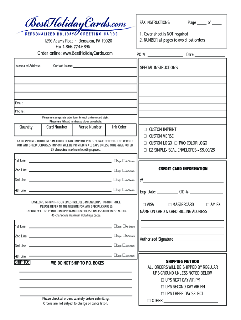 FAX INSTRUCTIONS1. Cover sheet is NOT required 2. NUMBER all pages to avoid lost orders1296 Adams Road Bensalem, PA 19020 Fax 18667746896Order online: www.BestHolidayCards.com Name and Address PO