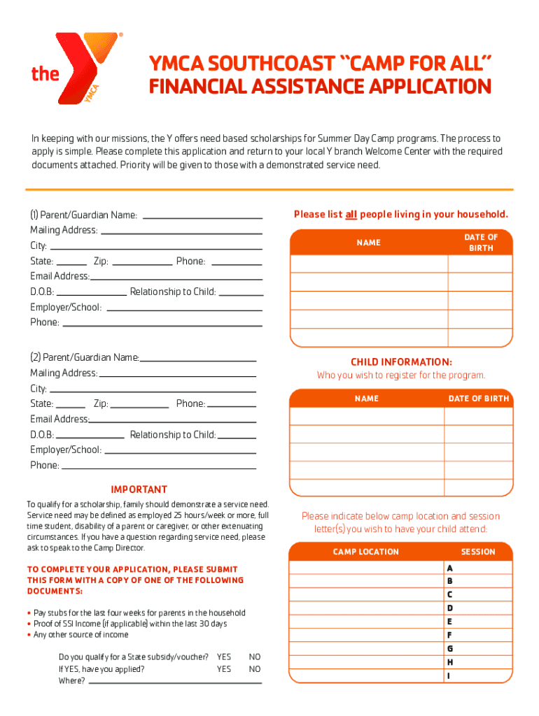 Get the free YMCA SOUTHCOAST CAMP FOR ALL FINANCIAL ASSISTANCE APPLICATION