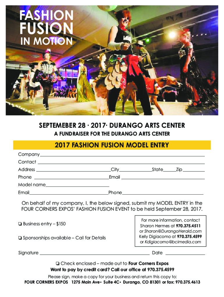FASHION O N FASHIONS FUSION U e IN MOTION d constructedSEPTEMEBER 28 2017 DURANGO ARTS CENTER A FUNDRAISER FOR THE DURANGO ARTS CENTER2017 FASHION FUSION MODEL ENTRY Company Contact Address City State