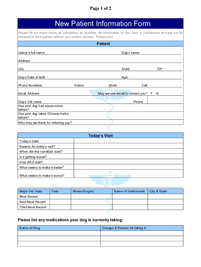The dognew patient formdoc is required for new dog patients visiting a veterinarian's office for the first time.