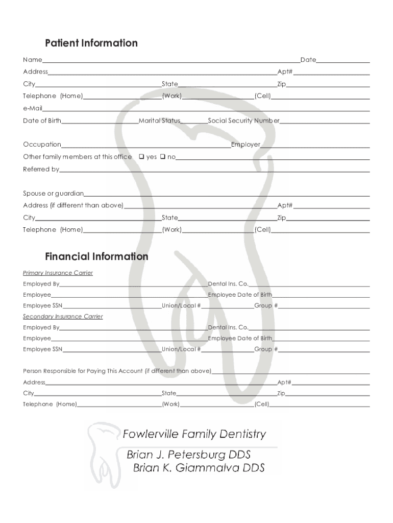Patient Information NameDateAddressApt#CityStateTelephone (Home)(Work)Zip (Cell)email Date of BirthMarital StatusSocial Security NumberOccupation Other family members at this officeEmployer yes referred