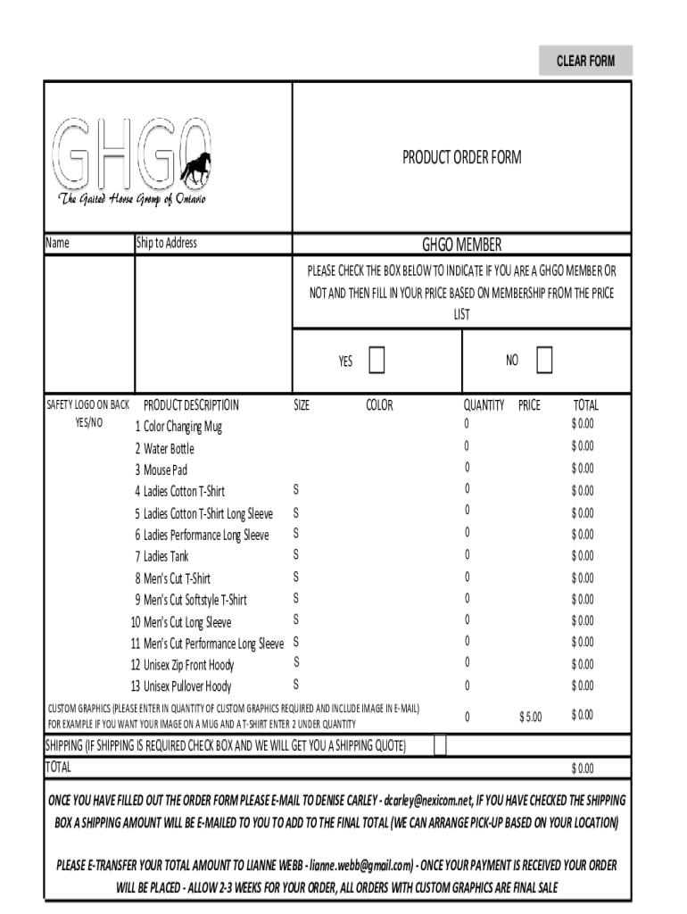 CLEAR FORMPRODUCT ORDER FORMNameGHGO Membership to AddressPLEASE CHECK THE BOX BELOW TO INDICATE IF YOU ARE A GIGO MEMBER OR