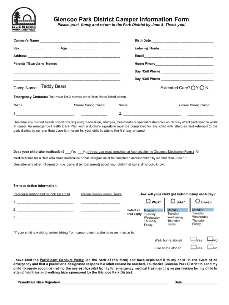 Glencoe Park District Camper Information Form Please print firmly and return to the Park District by June 8. Thank you! Campers Name Birth Date Sex Entering Grade Age Address Email Parents/Guardians