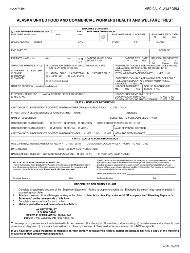 PLAN F45MMEDICAL CLAIM FORMULAS UNITED FOOD AND COMMERCIAL WORKERS HEALTH AND WELFARE TRUST Check here if your address is new. EMPLOYEE NAME Firstborn ADDRESSEMPLOYEE STATEMENT PART 1 EMPLOYEE INFORMATION