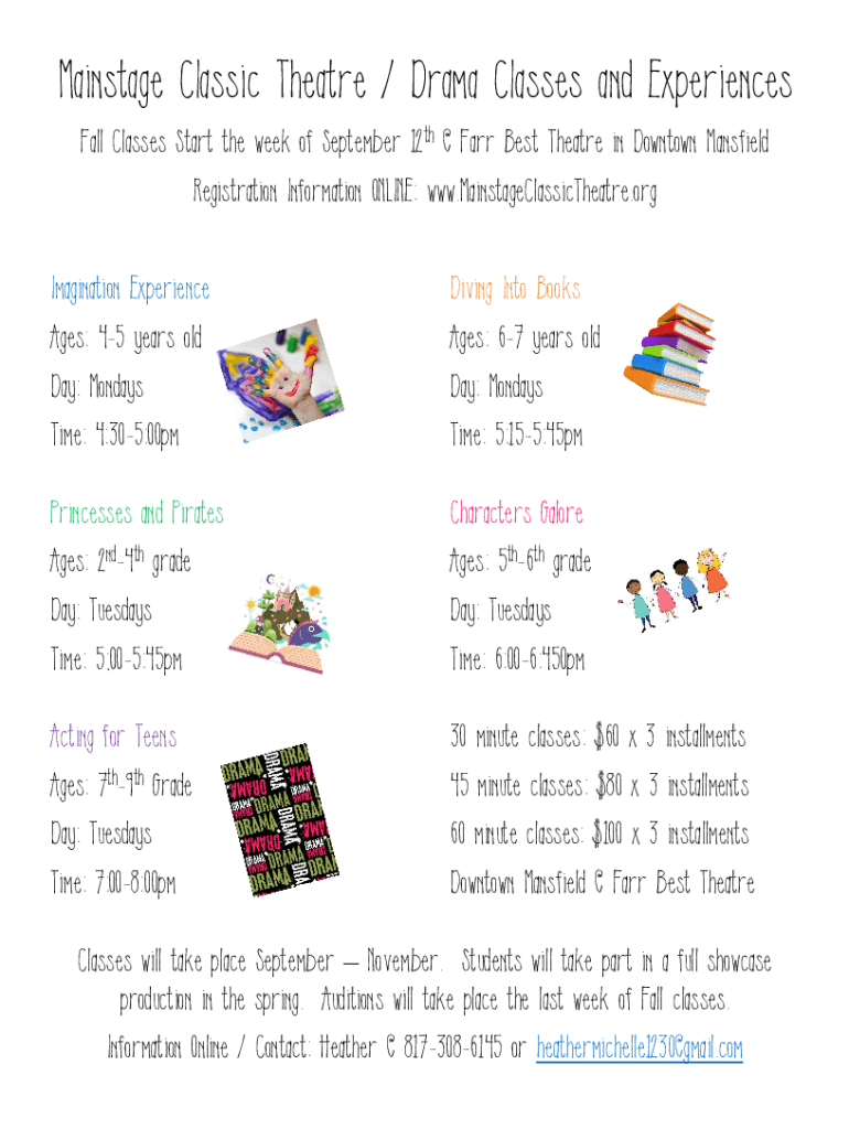 Main stage Classic Theater / Drama Classes and Experiences Fall Classes Start the week of September 12th Far Best Theater in Downtown Mansfield Registration Information ONLINE: www.MainstageClassicTheatre.org