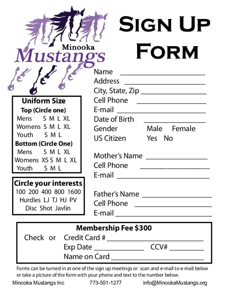 Sign Up Form Uniform Size Top (Circle one) Men S M L XL Women's S M L XL Youth S M L Bottom (Circle One) Men S M L XL Women's XS S M L XL Youth S ML Name Address City, State, Zip Cell Phone Email