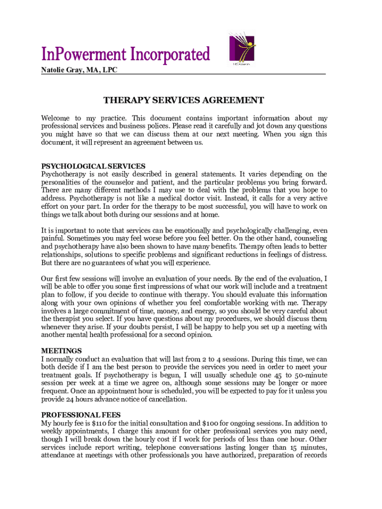 Natalie Gray, MA, THERAPY SERVICES AGREEMENT