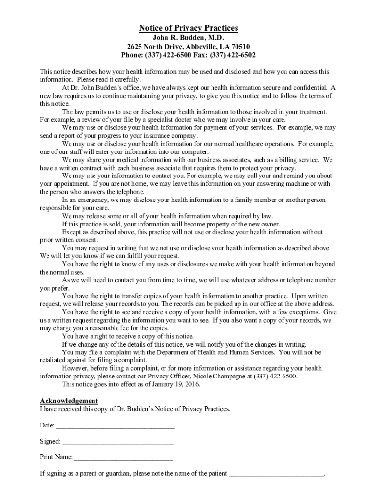 Get the free Notice of Privacy Practices John R. Budden, M.D. 2625 North ...