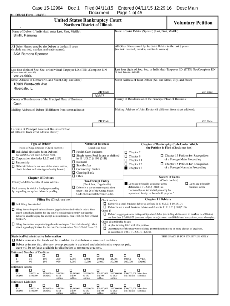 Case 1512964Doc 1Filed 04/11/15 Entered 04/11/15 12:29:16 Document Page 1 of 45B1 (Official Form 1)(04/13)United States Bankruptcy Courtesy Involuntary PetitionNorthern District of Illinois b k 1