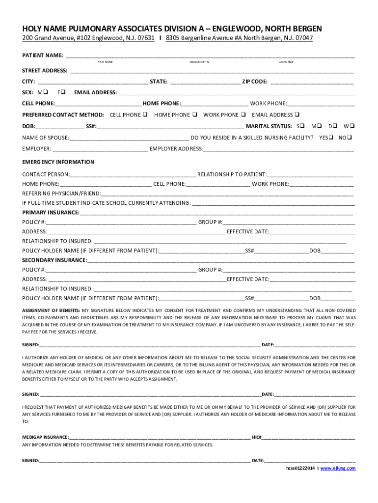 HOLY NAME PULMONARY ASSOCIATES DIVISION A ENGLEWOOD, NORTH BERGEN 200 Grand Avenue, #102 Englewood, N.J. 07631 I 8305 Bergen line Avenue #A North Bergen, N.J. 07047 PATIENT NAME: FIRST NAMEMIDDLE
