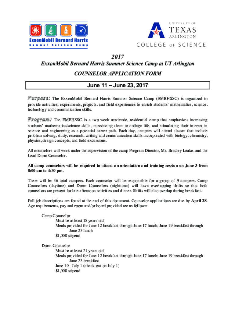 2017 ExxonMobil Bernard Harris Summer Science Camp at UT Arlington COUNSELOR APPLICATION FORM June 11 June 23, 2017, Purpose:The ExxonMobil Bernard Harris Summer Science Camp (EMBASSY) is organized